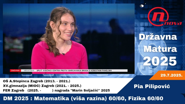 Pia delivered extraordinary results on the Croatian national high‑school exit exams (državna matura). She scored a perfect score on the physics and mathematics (A‑level) exams, while also achieving 91.82 % in Croatian language and 85.5 % in English. Her flawless performance in the most complex quantitative subjects earned her the Soljačić Prize.