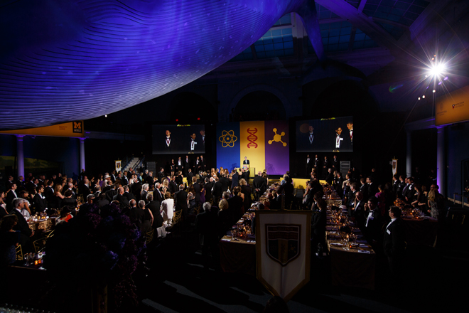 The evening formally began as the brass ensemble of the renowned Juilliard School played a processional of Fanfare for the Common Man and New York City high school students with a passion for science served as flag holders for the grand entrance of the Finalists and Laureates into the museum’s famed Milstein Hall of Ocean Life.