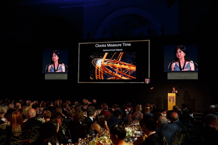 Physical Sciences & Engineering Laureate, Ana Maria Rey, PhD—a quantum physicist from the University Colorado Boulder and Fellow at JILA and the National Institute of Standards and Technology (NIST)—was next to accept her medal. The Blavatnik National Awards honored Rey for her pioneering contributions to the field of theoretical atomic, molecular, and optical physics, including her paradigm-shifting theories on atomic collisions that led directly to the development of the world’s most precise atomic clock. Her mentor and friend Jun Ye, PhD, a Professor Adjoint in Physics at the University of Colorado Boulder and a Fellow at JILA and NIST, praised Rey by stating, “Ana Maria is an amazing scientist…she is very creative and collaborative, and she is very capable of solving problems ranging from practical to very deep scientific theoretical problems.”