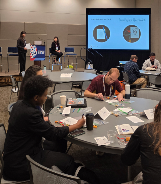 We then guided participants through an interactive activity that illustrated key principles necessary for turning complex ideas into discovery-driven experiences. Participants built simple circuits using a battery, an LED, and their own graphite drawing. When they saw the LED flicker to life through their drawing, the excitement in the room was palpable. Simple activities like these spark curiosity. Through trial and error, participants learned that failure is data. Failure, reframed as information, then becomes a powerful teaching tool.