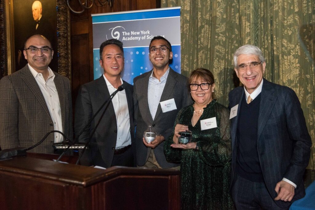 After Peter Salovey, PhD, the Chair of the Academy’s Board of Governors, recognized the Academy’s board members for their stewardship, he introduced the Cognizant STEM awards. “We all know how essential it is to grow the talent pipeline… and create a sense of belonging and shared commitment to harnessing the power of science for the good of humanity.” Newly sponsored by Cognizant — the Cognizant STEM Teacher of the Year and Cognizant STEM Mentor of the Year — were jointly conferred by Cognizant’s CFO, Jatin Dalal, and Chief Legal Officer John Kim. Rocheli Apilan, a teacher at the High School for Health Professions & Human Services, was named Cognizant STEM Teacher of the Year. Samay Garg, PhD, from Columbia University’s Department of Chemical Engineering, was named Cognizant STEM Mentor of the Year. Both were honored for their personal investment in developing the next generation of scientists through the Academy’s STEM education programs.