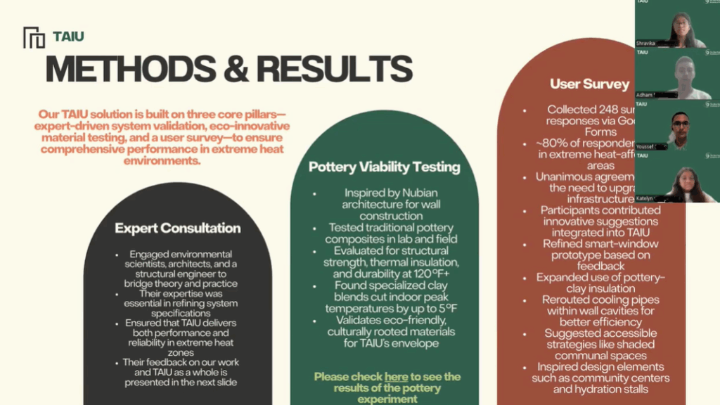 The Innovation Challenge, Living in the Extremes asked students to propose a comprehensive solution to sustain life in one “extreme environment.” The winning team for this challenge, comprised of five students from the United States, India, and Egypt, presented a solution for a “climate-ready community housing model” for extreme heat environments called TAIU (Technology, Architecture, Infrastructure, Urbanization). Individual TAIU houses are built with materials or mechanisms that actively resist heat and encourage cooling, notably the design of seven-layer walls and naturally ventilated interiors. Their solution also includes a center to provide goods and services to the community, as well as an app to control settings in individual homes.